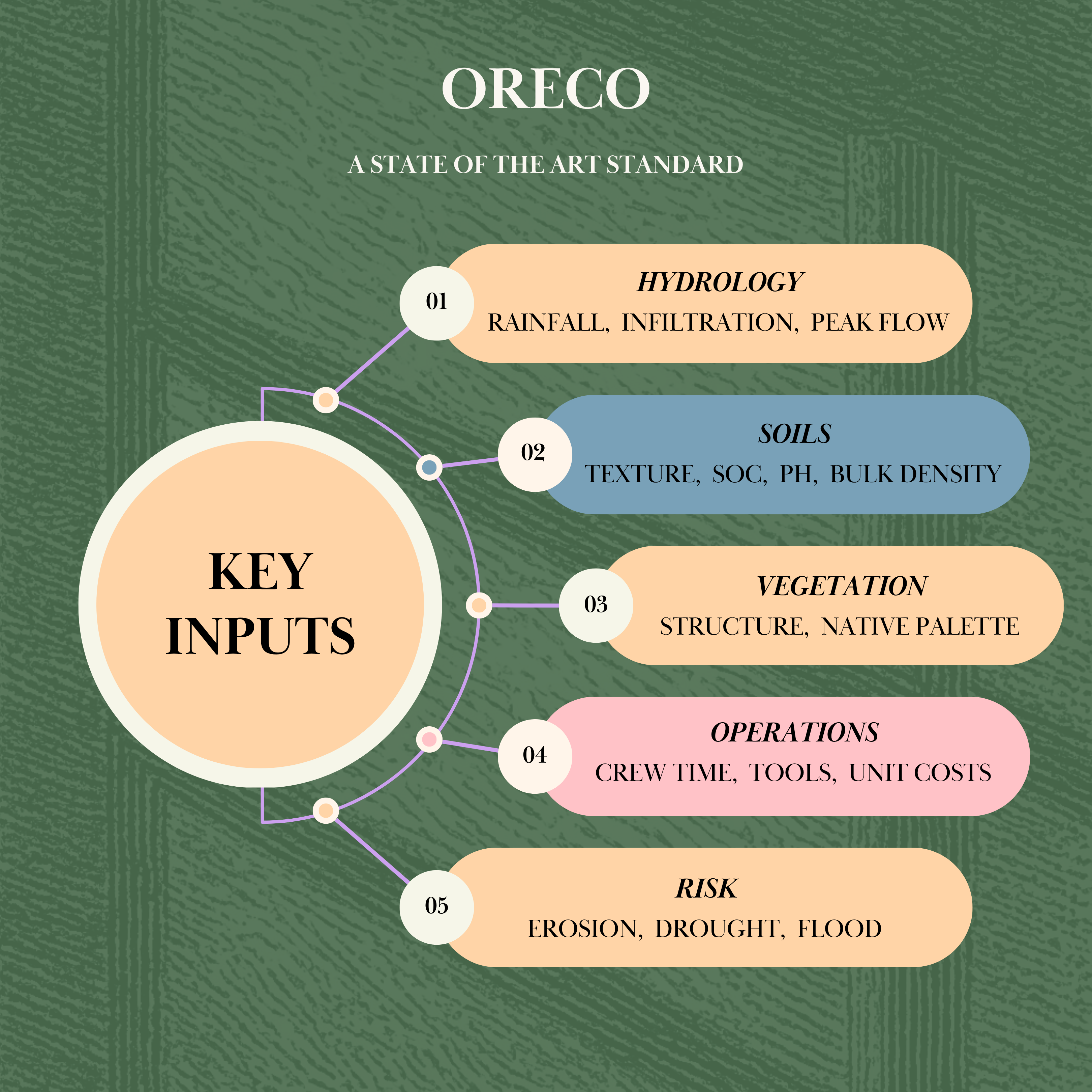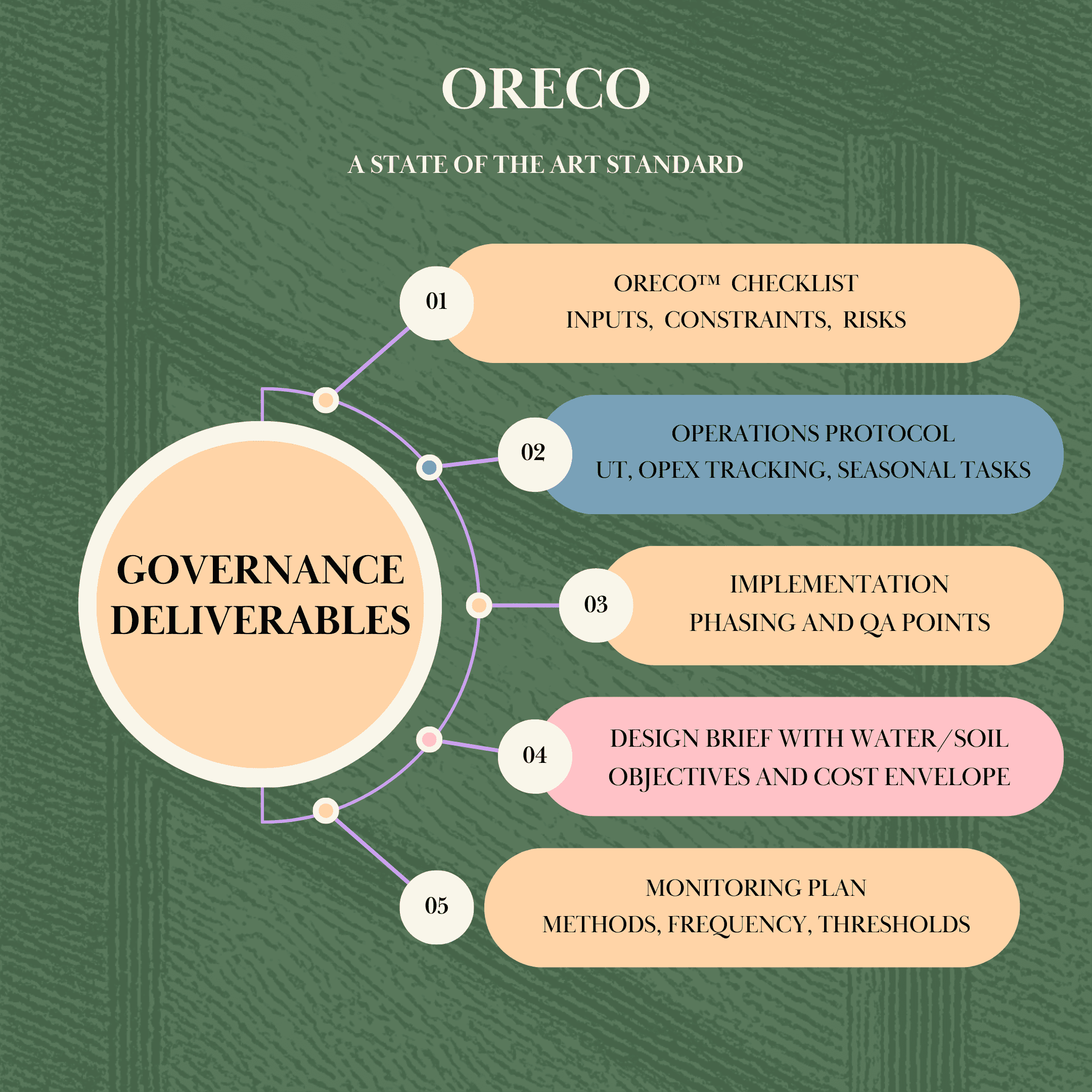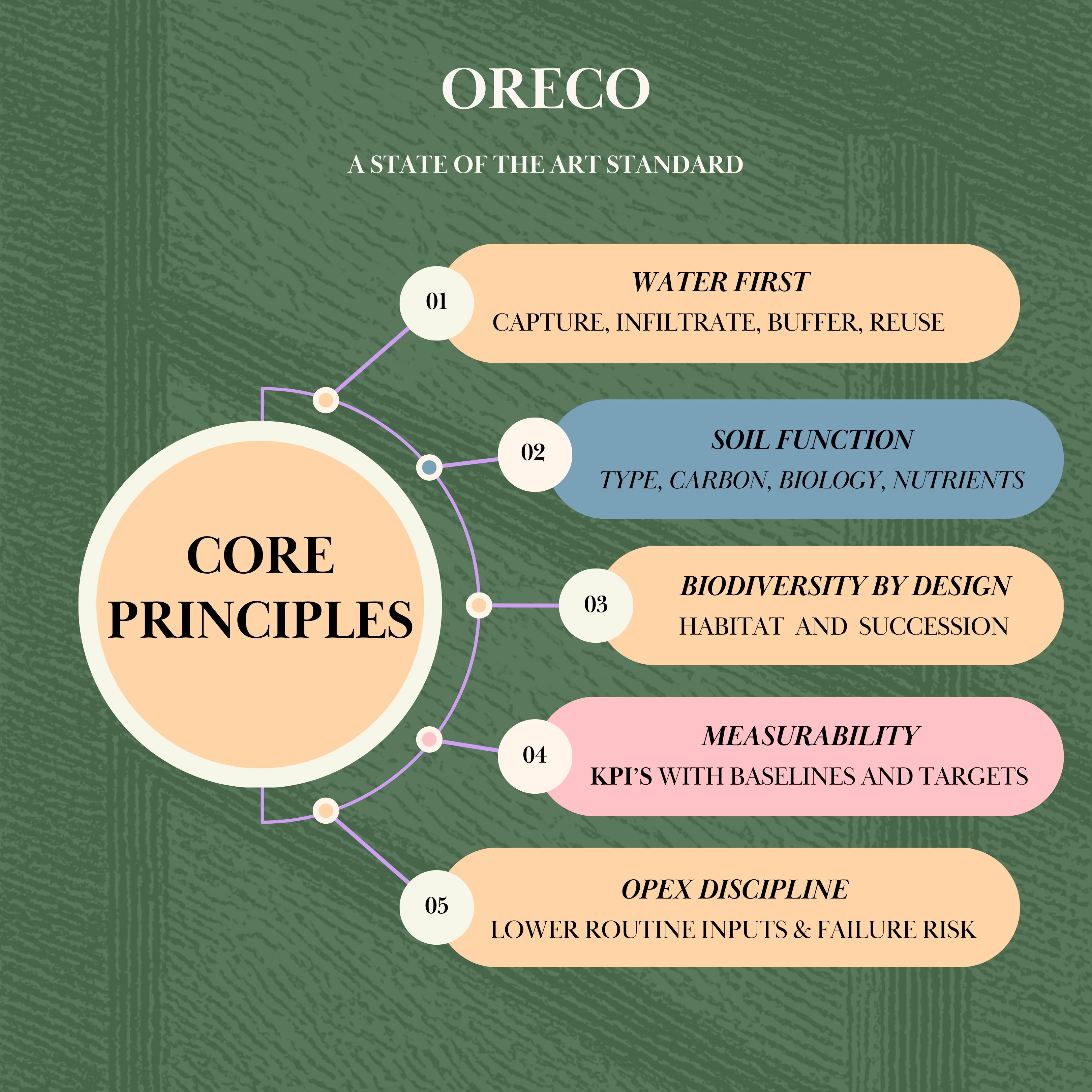 oreco™ is GBD’s project standard for water- and soil-science based habitat design. It aligns hydrology, soil function and biodiversity targets with measurable operations and total lifecycle cost control.
